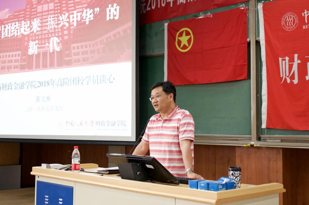 我院党委副书记黄文彬发表题为“做‘团结起来,振兴中华’的新一代——与夜色 2018年高阶团校学员谈心”的专题报告,指出应当高度关注青年价值观问题,引用习近平总书记五四青年节在北大的讲话,讲解了青年人树立正确价值观的重要性,以及什么是正确的价值观;带领学员们回顾历届党和国家领导人对于我校的重视,讲述了习近平总书记与我校三十多年来的密切联系,使学员们真切地感受到了党和国家领导人对我校的关心。黄书记介绍了财金领军人才成长“1682工程”行动计划,即“一个目标、六个平台、八项素质、两个注重”,总结了我院的青年工作和本年度在各类校级比赛中的表现并表示希望在团员骨干们能够总结经验、吸取教训,在接下来的活动取得更好的成绩。