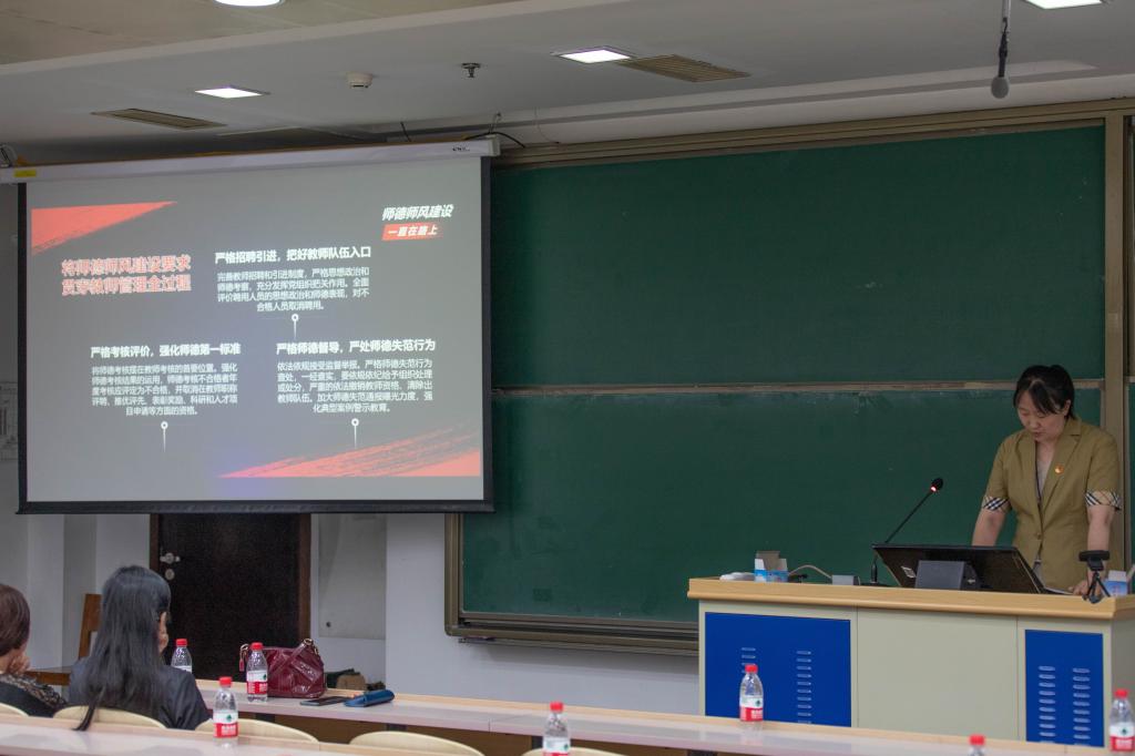 党委书记孙华玲首先介绍了师德师风专题教育工作的背景。经第十三届全国人大常委会第二十八次会议审议,《中华人民共和国教育法》第五条修改为“教育必须为社会主义现代化建设服务、为人民服务,必须与生产劳动和社会实践相结合,培养德智体美劳全面发展的社会主义建设者和接班人”,将党的教育方针落实为国家法律规范。她提到,为全面贯彻习近平总书记关于教育的重要论述和全国教育大会精神,深入落实《中共中央国务院关于全面深化新时代教师队伍建设改革的意见》,推进实施教育部等七部门《关于加强和改进新时代师德师风建设的意见》,学院积极组织开展师德师风专题教育活动。
