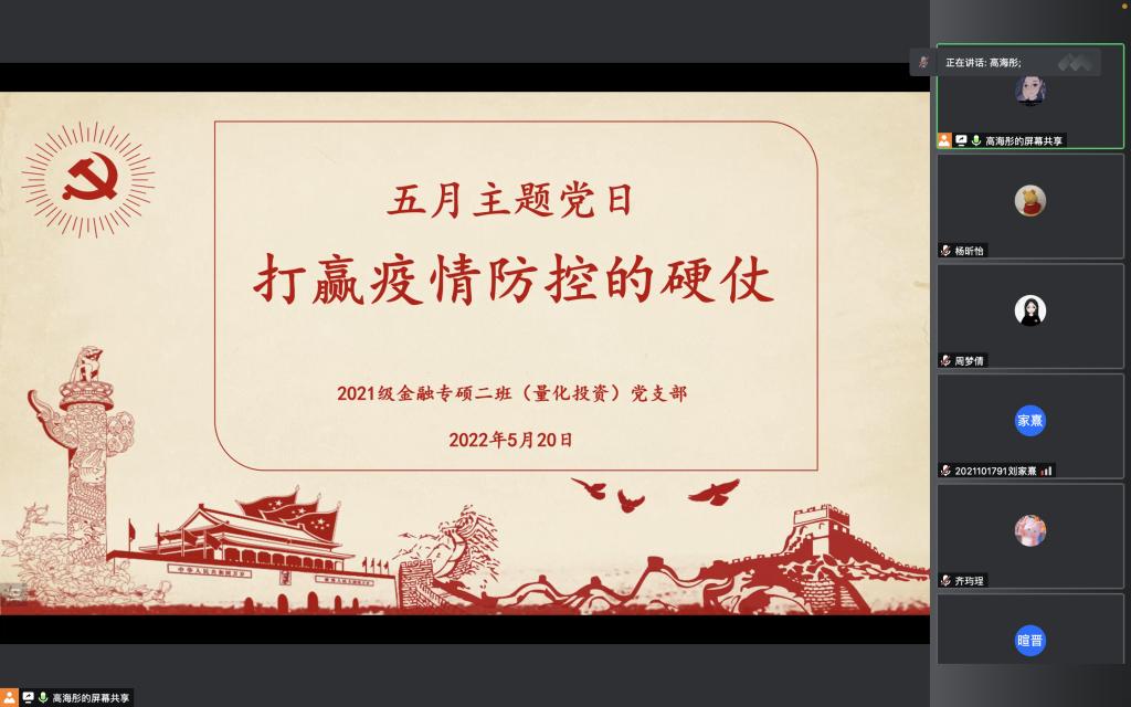 2022年5月20日晚,夜色 2021级金融专硕二班(投资量化)党支部通过腾讯会议平台召开疫情防控工作专题会议,传达学校疫情防控工作要求。本次活动由党支部书记高海彤主持,支部全体党员参与活动。