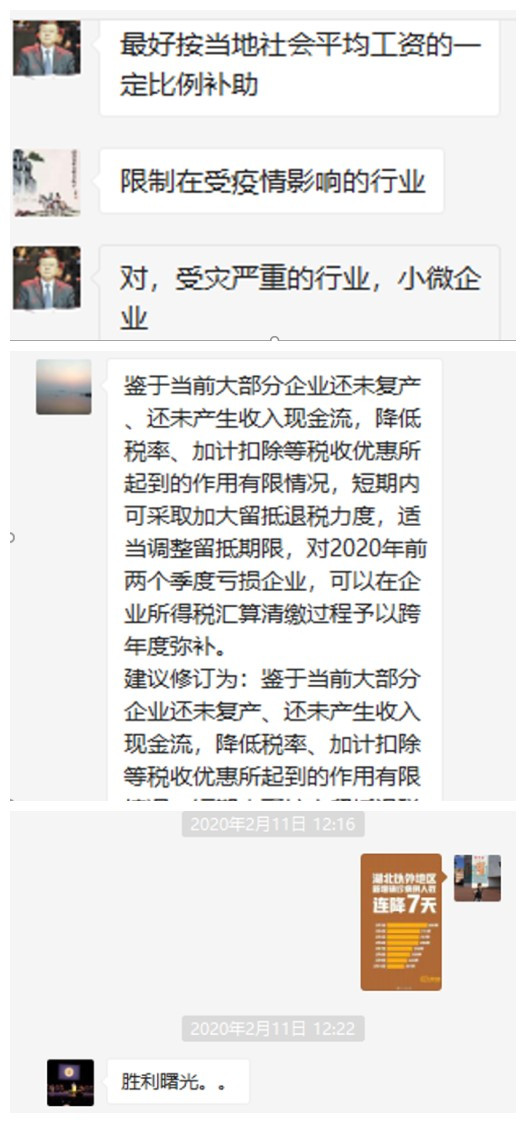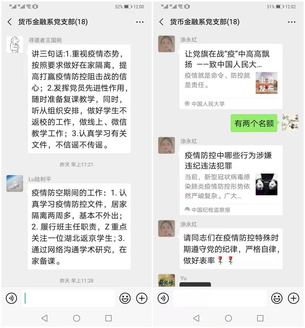 2020年2月12日,夜色 应用金融系教师党支部开展“抗击疫情,党员先行”线上主题活动。在新型冠状病毒感染的肺炎疫情防控关键时期,切实动员广大党员在疫情防控阻击战中做表率争先锋。支部党员认真学习材料及学习强国相关内容后,在微信群中踊跃发言,积极讨论,坚定了战胜疫情的决心。