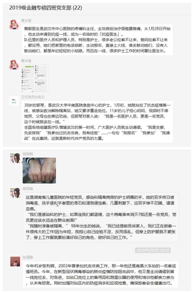 2019级金融专硕四班党支部成员分别向大家分享了在抗击疫情中党员们的先进事迹。其中有主动申请到抗疫一线的医护人员,有为游客检测体温的客运值班员,也有主动为值班人员提供食物的夫妇……无论是医务人员还是基层公务人员,亦或是普通市民,作为党员的他们都在抗击疫情中挺身而出,用实际行动诠释了作为一名共产党员的初心和使命。通过此次学习活动,党员同志们将以更积极的态度,争先锋做表率,带头打赢这场疫情防控阻击战。