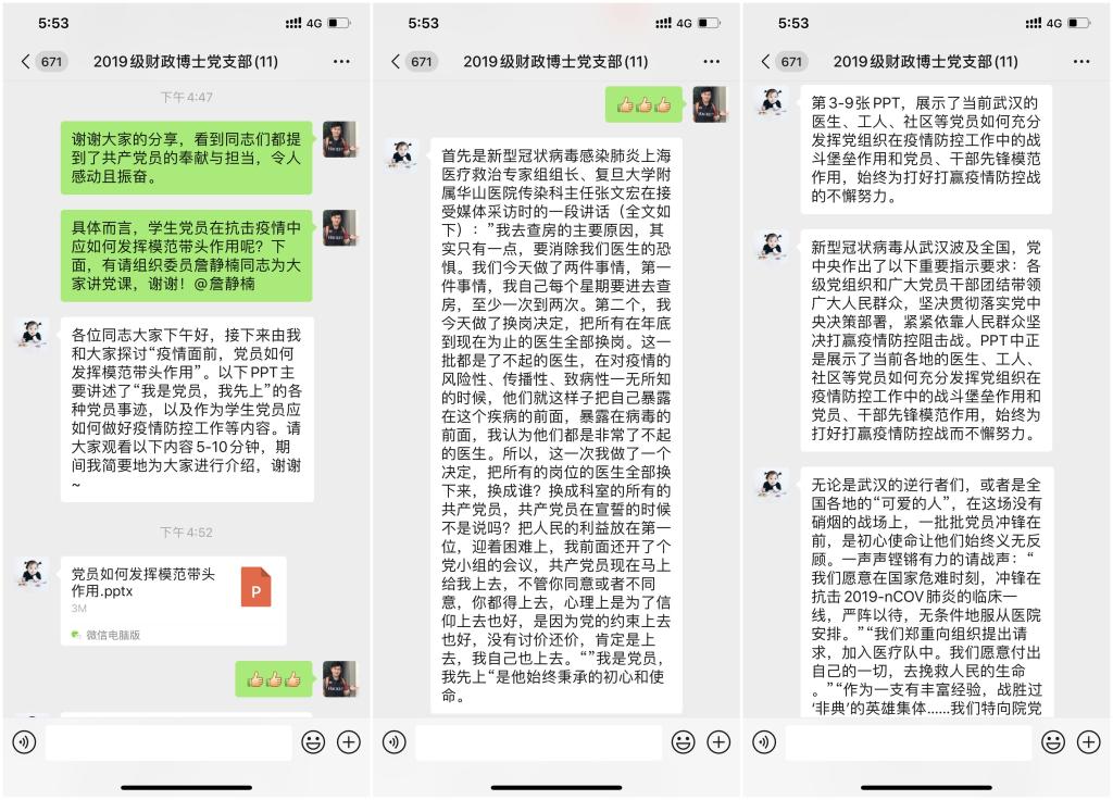 2019级财政博士党支部组织委员詹静楠同志为支部党员讲“在疫情面前充分发挥党员模范带头作用”主题党课。她首先向各位同志们介绍了“我是党员,我先上”的党员先进事迹,接着就学生党员如何做好疫情防控工作展开了具体阐述。她强调,每位同志应当以实际行动助力抗击疫情,首要做到在源头上杜绝病毒传染扩散的可能。本次党课充分调动了支部党员自主学习防疫知识的积极性,强化了同志们的责任意识与奉献精神。