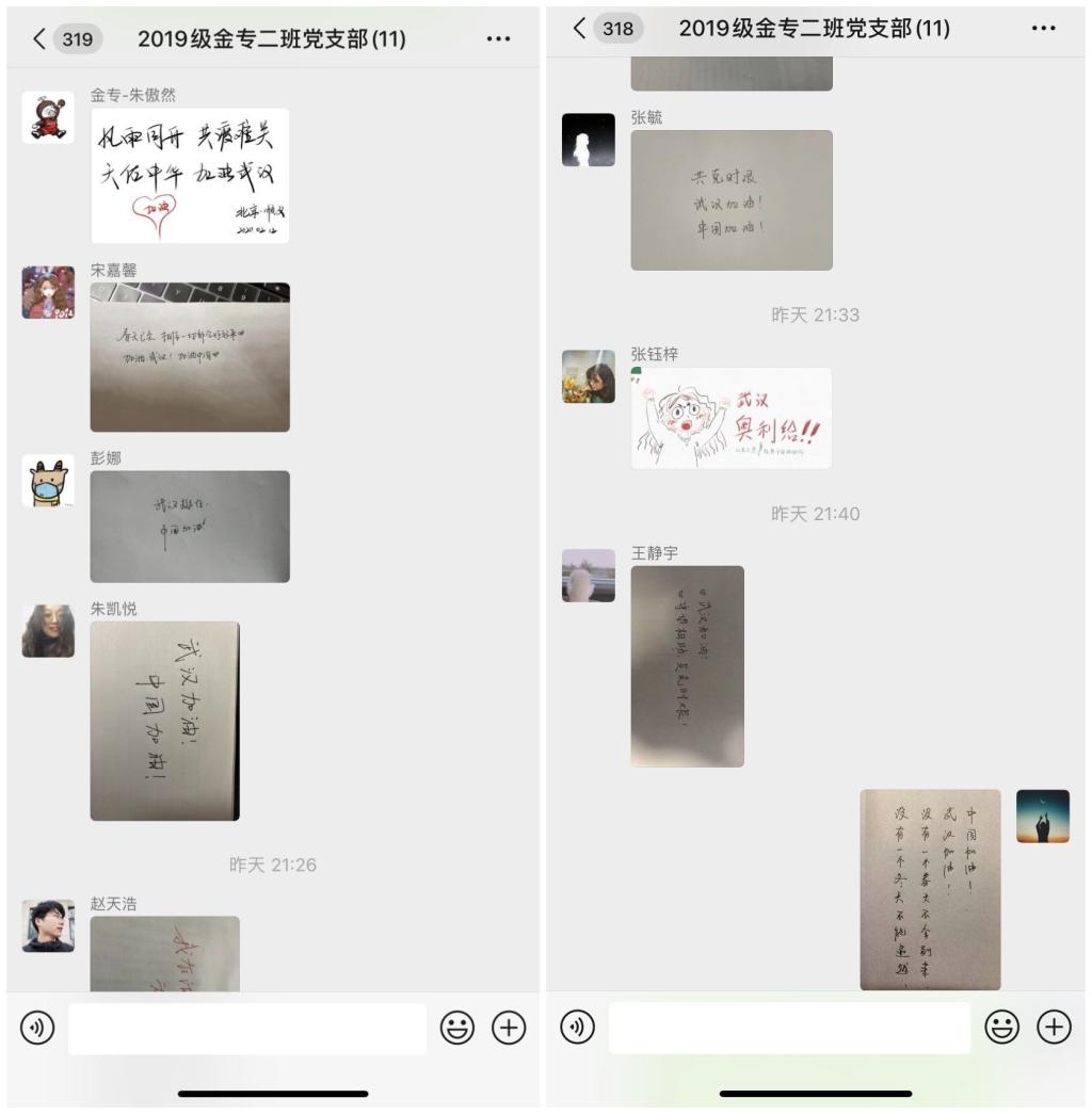 2019级金融专硕二班党支部全体党员同志纷纷写下自己的祝福,“风雨同舟 共渡难关”、“共克时艰,武汉加油”、“没有一个冬天不能逾越,没有一个春天不会到来”......一条条祝福饱含着支部党员与祖国和人民同在的责任担当及同心抗“疫”、战“疫”必胜的信心,相信在习近平总书记和党中央的坚强领导下,一定可以打赢这场不见硝烟的战“疫”!