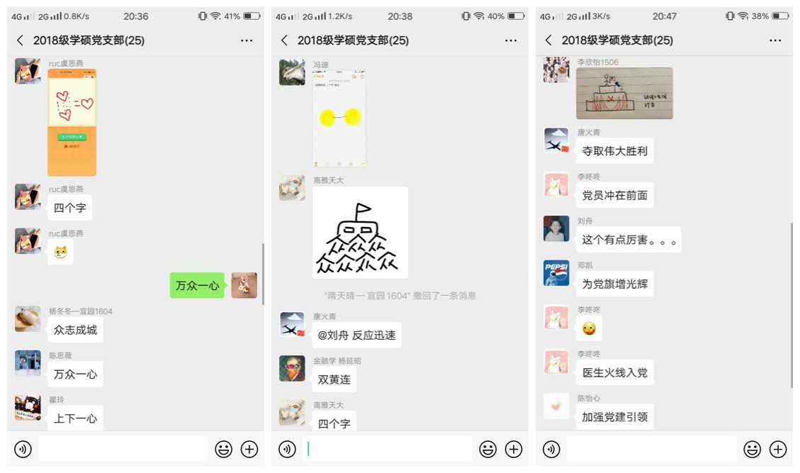 2016级本科第三党支部线上主题党日活动采用“分享身边党员抗击疫情感动事迹”方式进行,支部党员结合身边人身边事,积极分享党员抗击疫情的真实故事。在各个行业都有党员奋战在疫情一线,担起责任,动员群众,坚决贯彻党中央关于疫情防控各项决策部署,坚决贯彻坚定信心、同舟共济、科学防治、精准施策的总要求。支部成员纷纷表示向他们致敬,要学习这种奉献精神,充分发挥党员的先锋模范作用。