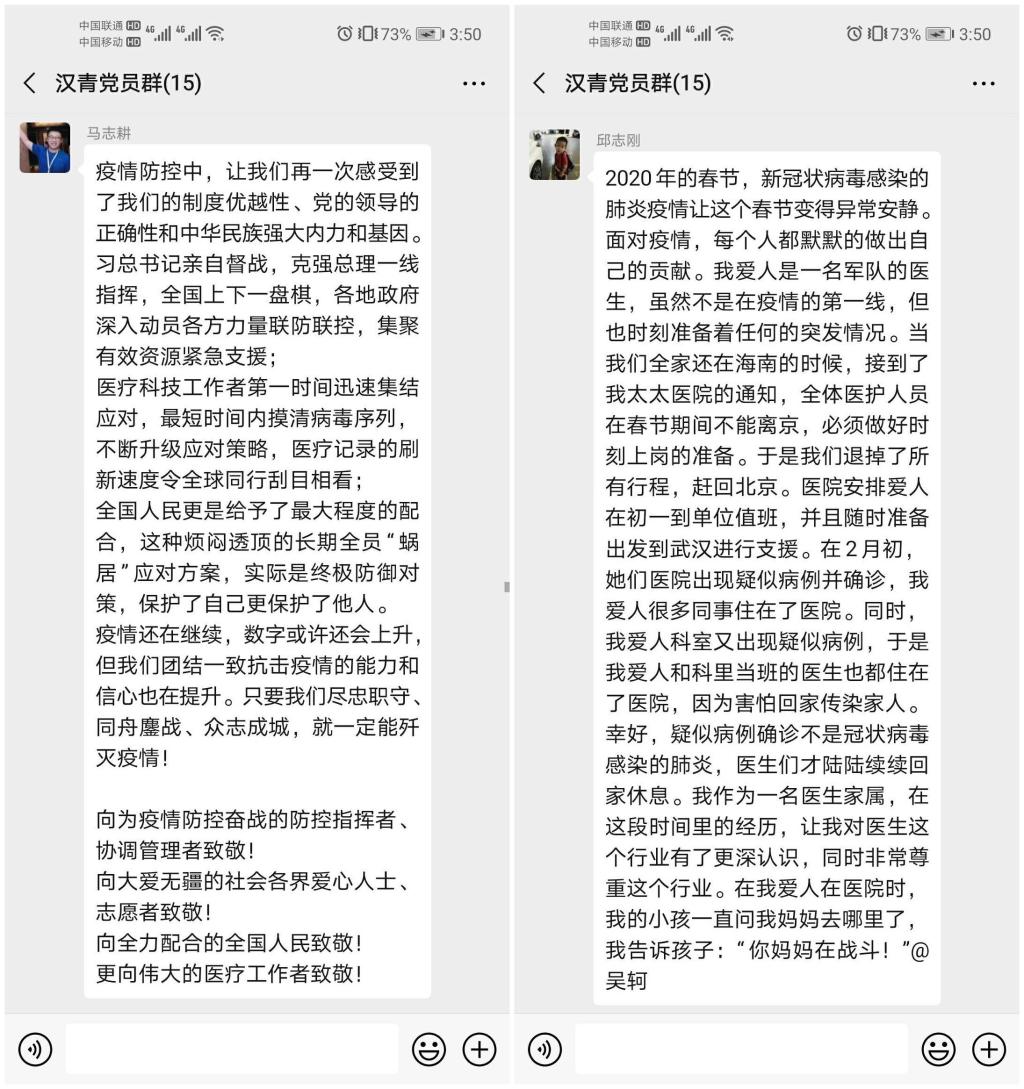 为更好发挥基层党组织战斗堡垒作用,切实动员广大党员在疫情防控阻击战中作表率争先锋,汉青教工党支部于2020年2月9日组织开展“抗击疫情,党员先行”线上主题党日活动。本次活动以2月3日“习近平总书记在中共中央政治局常务委员会会议关于坚持全国一盘棋,汇聚抗击疫情强大合力”的重要讲话精神为指导,以微信群集体讨论讨论位主要形式,支部成员教师分别就抗击疫情发表了自己的看法。