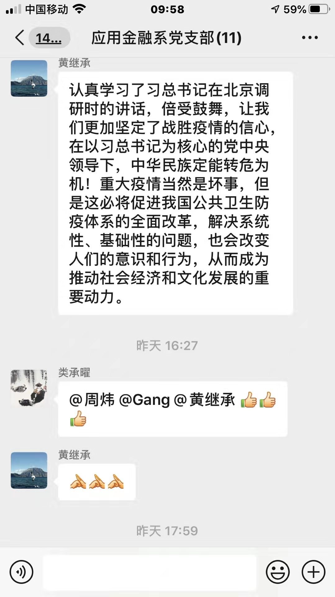 财政系党支部于2020年2月11日召开线上支部会议,全体党员教师学习习近平总书记在北京市调研指导新型冠状病毒肺炎疫情防控工作时的讲话精神,大家表示要发挥党员模仿作用,积极遵守组织纪律,坚决拥护中央应对疫情的各项决定;大家也坚定信心,相信在以习近平同志为党中央的坚强领导之下,一定能打赢疫情防控阻击战。