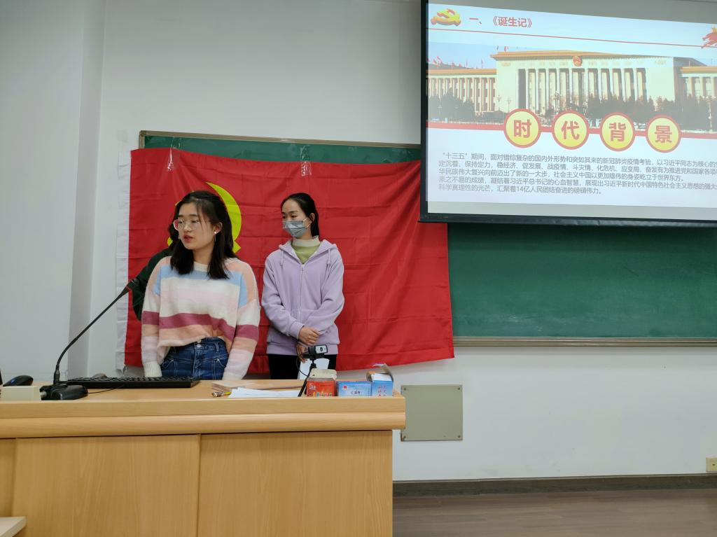 2020年11月11日晚,夜色 本科金融第五党支部于明德商学楼0301教室举行十一月主题党日活动。本次活动采取“党员讲党课”的形式,由党支部书记张莹策划,预备党员李文娟、姚楠、左越主讲,预备党员尚佳玉做幕后工作,主题是“学习十九大五中全会精神”。本次“党员讲党课”活动由党支部书记张莹主持。