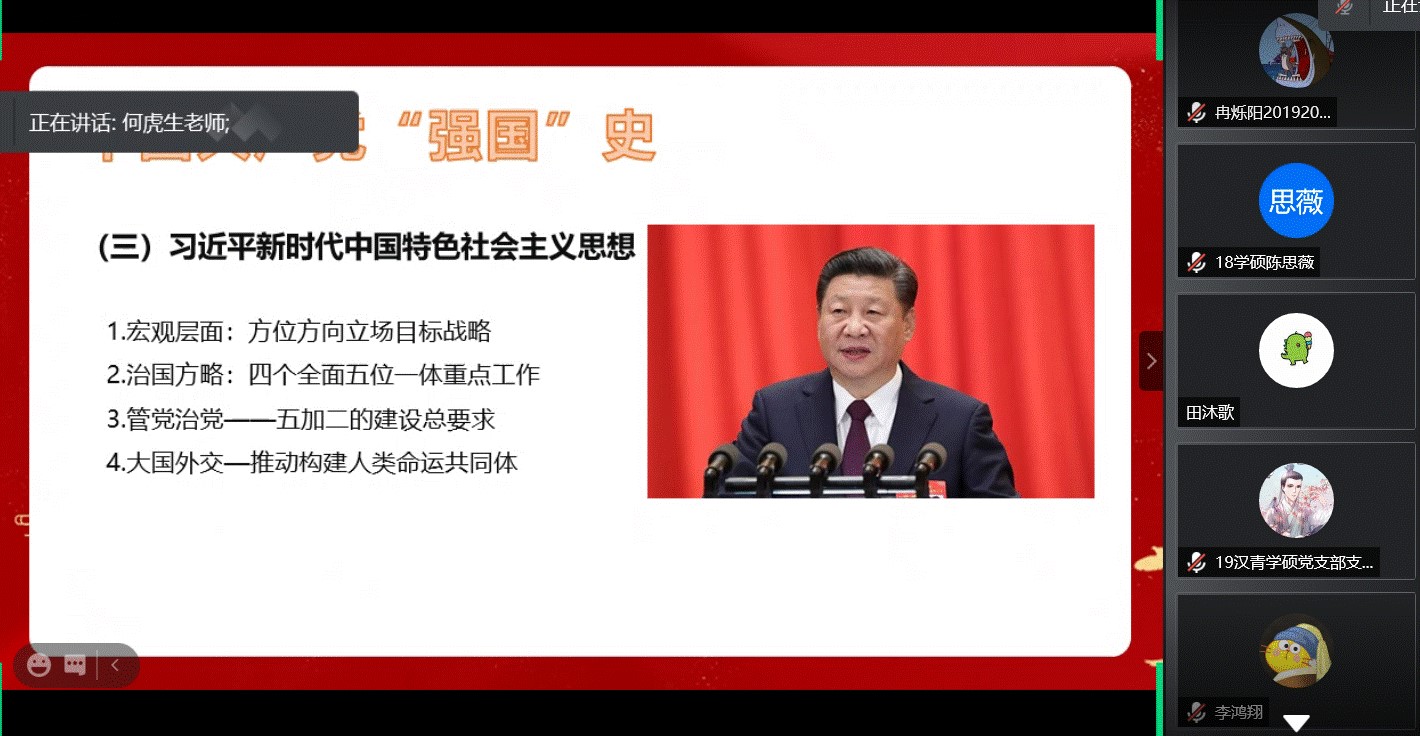 随后,何虎生教授以“救国、兴国、富国、强国”四个关键词为主线,讲述了中国共产党矢志践行初心使命的一百年。他解读了重点解读了党的十八大以来中国共产党的强国史,介绍了中国特色社会主义进入新时代以来我们取得的历史性的成就、发生的深层次的变革,强调了新阶段新格局的特殊性,阐述了习近平新时代中国特色社会主义思想以及习近平总书记的核心地位。