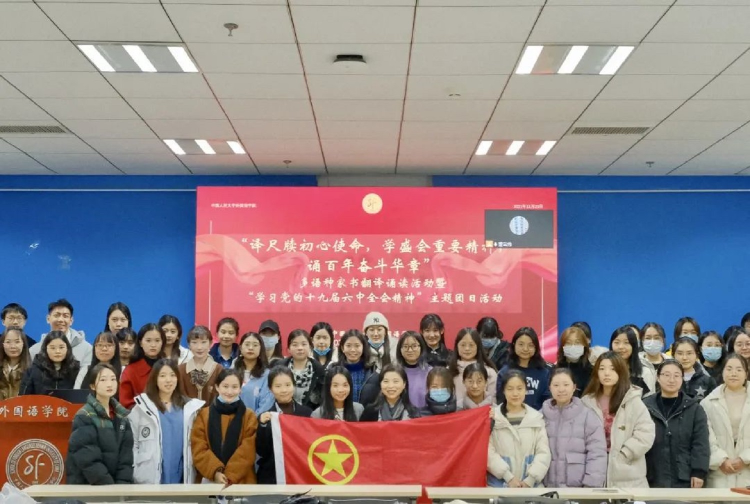 强化党建引领,以78.3%的中共党员及入党积极分子为建设基础,开展“庆祝建党100 周年”中国人民革命军事博物馆参观等联合“党·团”活动。累计开展11次主题团日活动,3次红色主题参访活动,参与校“第一封家书”活动,共寄家书30余封,在此基础上探索创新,开展家书多语种外译活动。