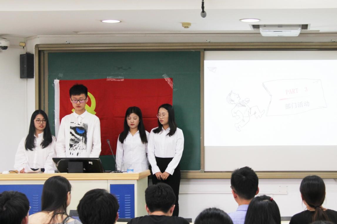 宣传部、培训部、办公室、纪检部、组织部和新媒体中心干事依次对本部门日常工作及部门成员进行介绍。