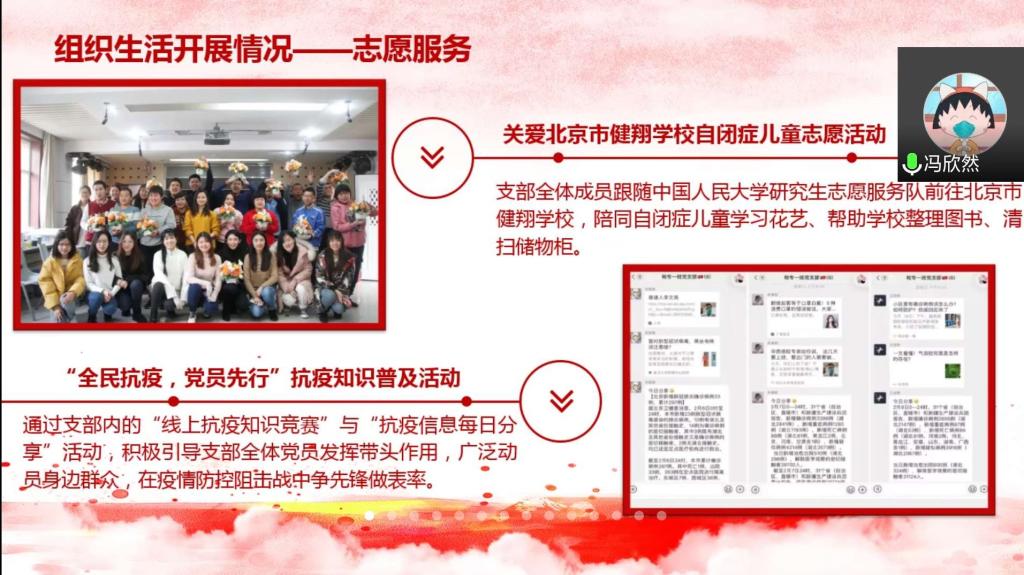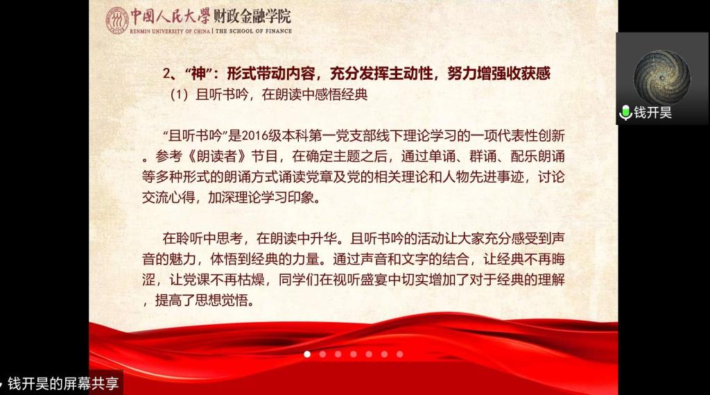 过去一年,学院各基层党支部工作成效显著。组织生活方面,各支部严格按照上级党组织要求开展理论学习,定期举办主题党日活动;同时创新活动形式,形成一系列支部特色活动。2016级本科第一党支部“且听书吟”读书感悟分享活动,朗诵经典名著,畅谈阅读感悟,巩固理论学习成果;2019级学硕党支部 “清北人”三校支部共建活动围绕十九届四中全会精神进行深入探讨,学精神、明方向;疫情期间,2019级金融专硕二班党支部成员手写祝福,将美好祝愿与必胜信心蕴藏在字里行间。