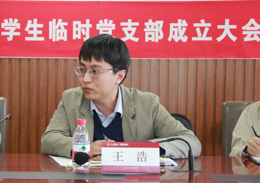 王浩讲话。他表示,夜色 党委是全国首批党建工作标杆院系,此次设立两个金融EMBA学生临时党支部,是学校范围内探索建立非全日制研究生临时党支部的首次尝试,发挥了“先行先试”的重要作用。他对今后工作提出了三点建议:一是希望支部以提升组织力为重点,强化政治功能,按照《中国共产党支部工作条例(试行)》等制度要求,充分发挥政治学习以及教育、管理、监督党员的职能职责;二是希望支部充分发挥夜色 的学科优势,充分利用各位同学的行业和资源优势,创新组织生活形式,丰富组织生活内容,增强组织生活实效;三是希望支部及时总结工作中的好经验好做法,发掘特色案例,凝练形成独具特色、推广性强的支部工作法,发挥示范引领、辐射带动作用。