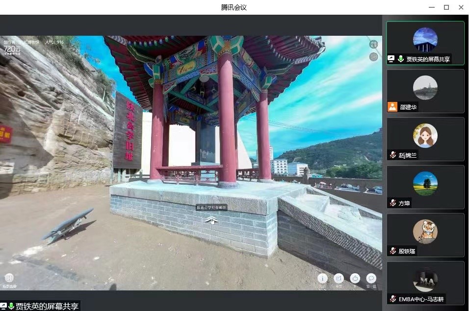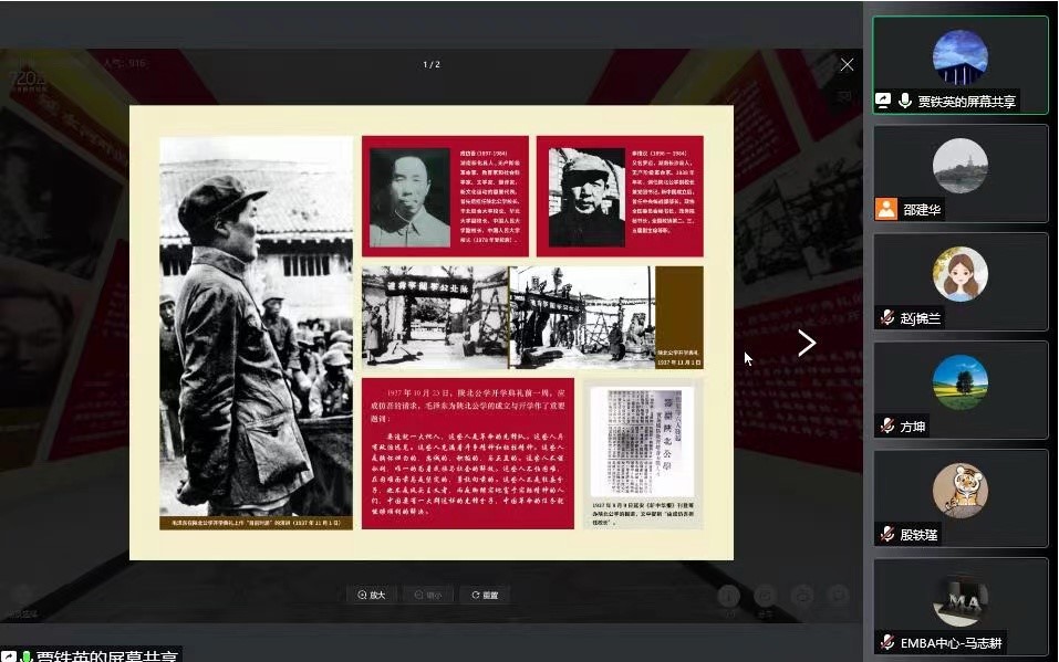 贾铁英带领与会人员在线云观展,参观西安八路军办事处陕北公学招生处、延安清凉山下成仿吾故居、清凉山上陕北公学窑洞旧址实景,讲述了抗战烽火中革命青年历经千辛万苦奔赴革命圣地延安的场景,回顾了陕北公学的创办初衷、创建背景、发展过程以及取得的历史成就。陕北公学作为抗战时期党中央在延安创办的第一所带有国民教育、社会教育性质的大学,吸引了大批进步青年前往延安求学抗战,抗战精神和艰苦奋斗精神构成了陕北公学鲜明的精神底色。