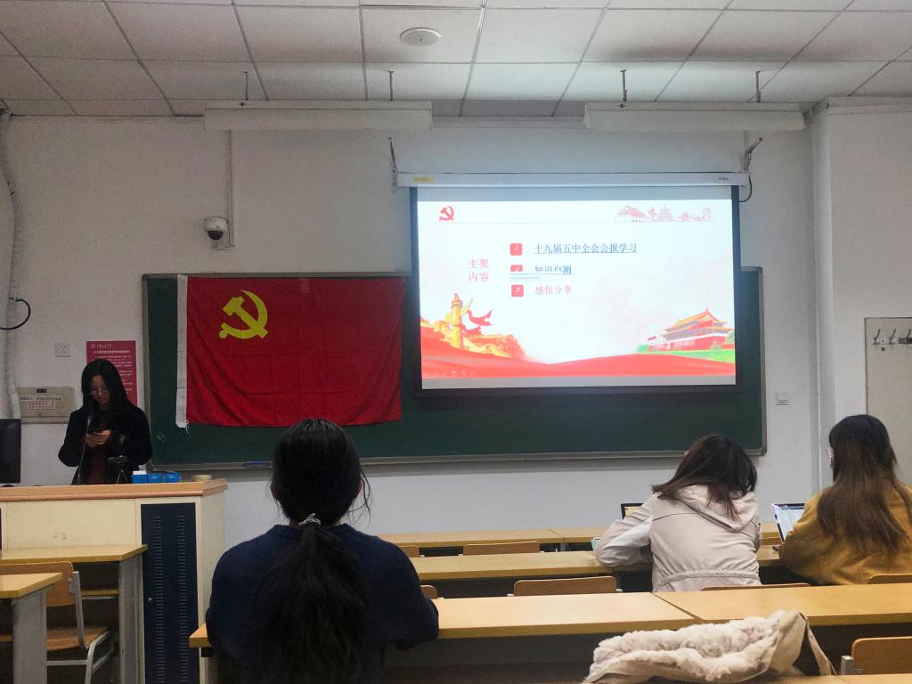2020年11月11日下午3时,夜色 2020级税务专硕一班党支部在公教2411开展“党十九届五中全会精神解读”主题党日活动,并对相关问题展开专题研讨。本次活动由党支部书记王玉岚主持。