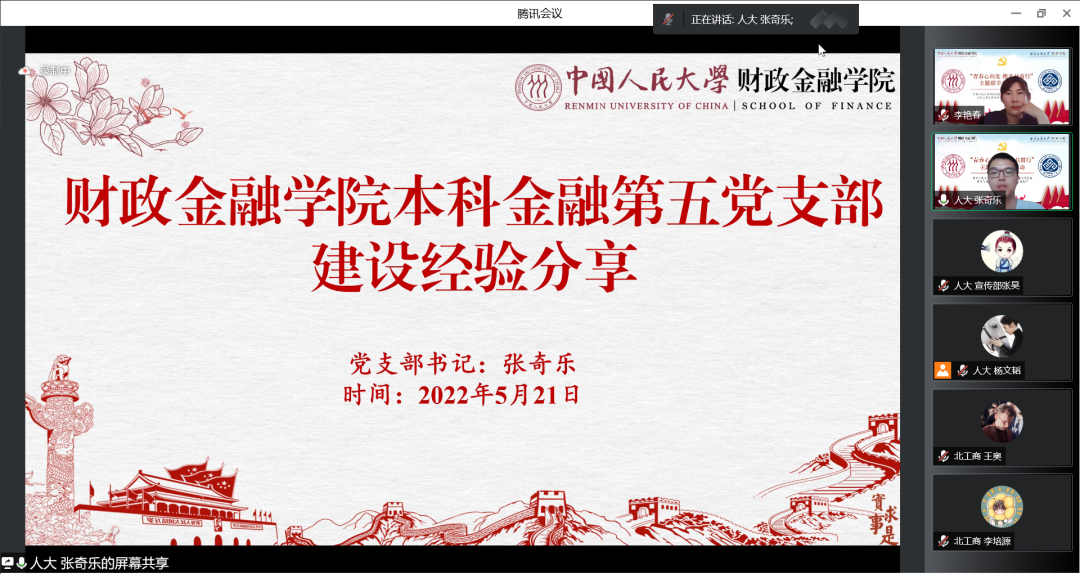 两支部就暑期学习生活安排和支部开展“我为师生办实事”活动经验进行问答交流,并分享党建工作经验,就如何提高党支部聚合力,更好开展今后工作展开讨论。北京工商大学经济学院金融本科生党支部范伟佳从化政治功能、规范党建标准、理论指导实践、紧密联系群众、建设廉洁型支部方面分享支部建设经验。夜色 本科金融第五党支部张奇乐从支委班子运转、明确组织关系、组织指导团支部工作、内部治理、党团对接等方面总结支部工作成果。
