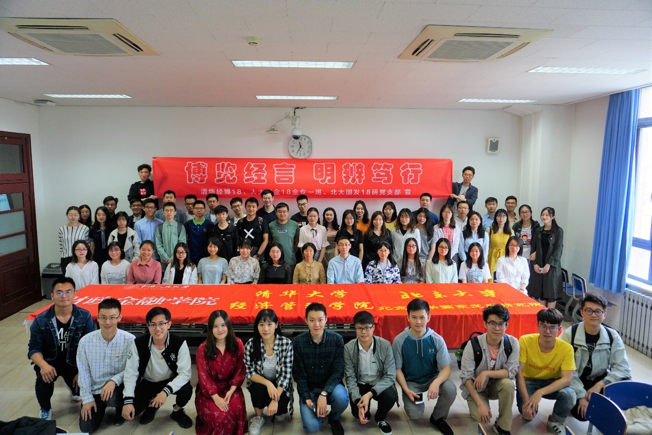 为纪念中华人民共和国建国70周年和五四运动100周年,进一步学习贯彻习近平新时代中国特色社会主义思想,加强学风建设,加强与友校党支部的交流学习和相互联系,2019年5月11日上午,夜色 18级金融专硕一班党支部、北京大学国家发展研究院18级研究生党支部和清华大学经济管理学院经博18党支部在清华大学新水利馆327教室举办了以“博览经言树学风,同心共筑中国梦”为主题的三校党团共建活动。活动旨在倡导牢记建国70周年革命成果,在当代大学生中树立优良学风,为实现中华民族伟大复兴的中国梦添砖加瓦。除了各支部的党员,出席本次活动的还有发展对象、积极分子和优秀团员代表。