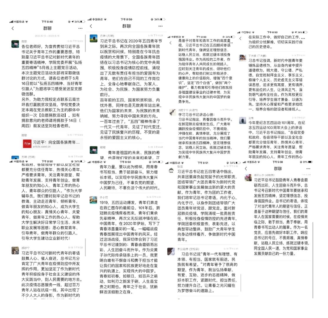 本次主题党日活动支部采取线下自学和线上微信群讨论相结合的方式。在认真学习了习近平总书记五四讲话内容后,支部副书记方坤同志以“五四”精神见证时代变迁和民族复兴为题率先发言;支部书记刘芳同志围绕教育工作者应关注青年成长、倾听青年心声、帮助青年树立健康向上的价值取向为题发言;刘庭竹同志结合自身实际工作,发表为组织分忧、践行党员使命的感言;丁大鹏同志从提升道德修为的角度谈了引导、培养学生以德为先、成为合格的建设者和接班人之责任;兰青同志结合习近平总书记在五四运动百年讲话内容,谈了青年辅导员做好青年思想工作的几个途径;郝妙宁、孙可、张浩同志从团学工作角度,结合疫情防控,恳谈青年榜样力量、青年战疫风采、先进青年的示范效应;贺松霖、陶然和刘桂香同志从自身角度出发,抒发守初心、担使命、讲奉献的党员职责。