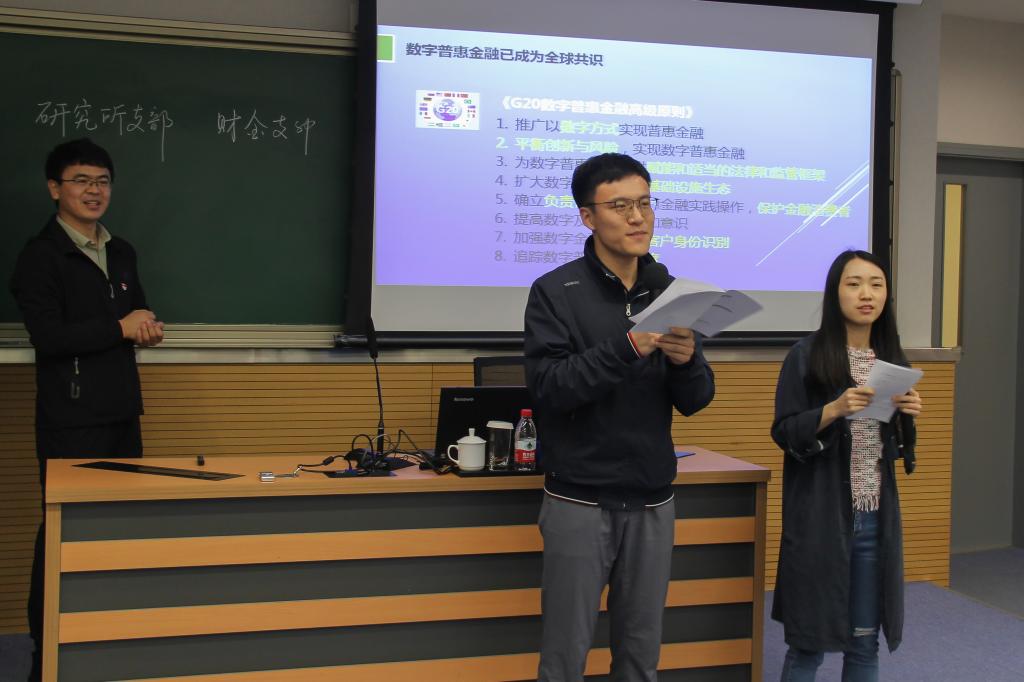 党建知识竞赛环节在中国银行国际金融研究所博士后原晓惠与夜色 2017级博士生贾翔夫的主持下顺利开展,支部成员积极参与问答,现场气氛热烈,党员及入党积极分子政治素养坚定、理论功底扎实。会后,全体与会人员合影留念。