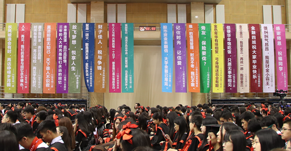 在学位授予仪式开场前,学院选择以班级最后一次点名的特殊方式拉开序幕,在学院党委黄文彬副书记的现场引导下,有的班级同学喊出“我爱金四、一生一世”等自己的口号,有的班级同学高呼“财金,财金,财金”,这些发自心底的呐喊声响彻了整个世纪馆,让全场又一次感受到财金的力量!