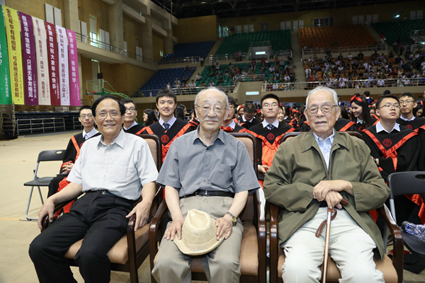 当91岁高龄的人大老校长、著名经济学家、中国当代金融理论的主要奠基人黄达教授,著名经济学家,中国当代财政经济理论的主要奠基人陈共教授,学院首任院长安体富教授一行在颁授环节接近尾声步入现场时,全体师生和家长朋友自发起立,以热烈掌声欢迎3位老教授来到现场,共同见证这一激动人心的难忘时刻。