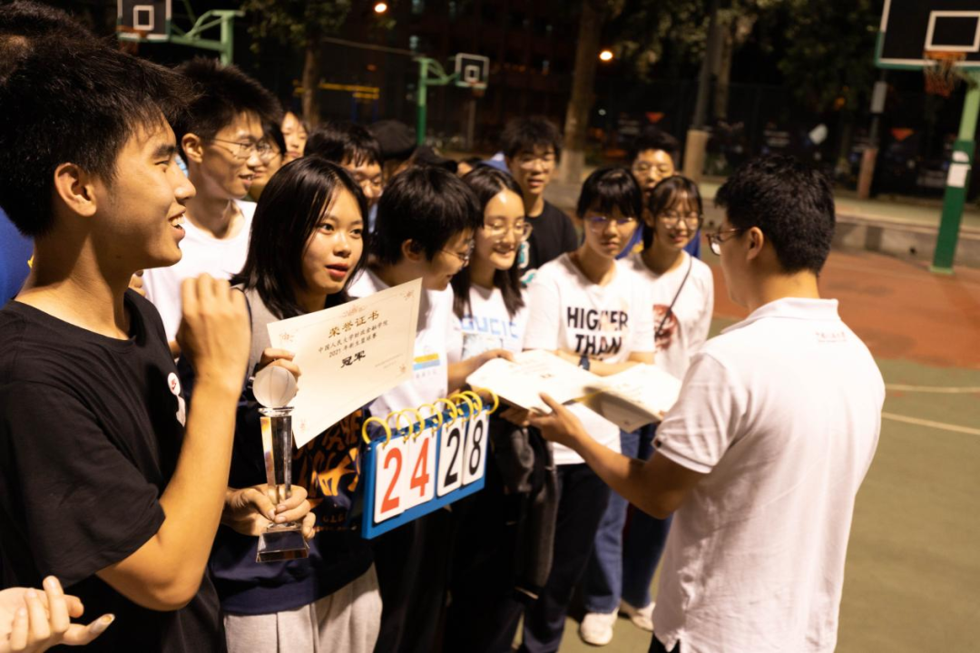 第四节双方稍显疲态,均出现了微小失误。但在本班场外同学的呐喊助威下,双方很快找回了状态。四班顶住压力,连续进球得分。二班队员试图稳住局势,迅速调整战术——由进攻转为战略防守。在二班队员严防死守下,四班队员始终难以获得重大突破,二班始终保持着微弱优势,而四班队员不断寻找机会,在最后时刻,四班队员放手一搏,组织起一波波猛烈进攻,全场观战的同学都屏住了呼吸。但二班队员不骄不躁,积极组织防守。突然,裁判一声哨响,四班队员犯规!二班队员立即利用这次罚球机会,拖住对方的进攻。随着罚球结束,比赛终止,比分定格在28:24,金融二班以小比分险胜金融四班,问鼎新生篮球赛,金融四班荣获亚军。赛后,夜色 团委书记秦天为新生篮球赛冠亚军颁发奖杯奖状,为其余各班颁发气氛奖。颁奖后,两班队员举起班旗,拍下合影,纪念这难忘的时刻。