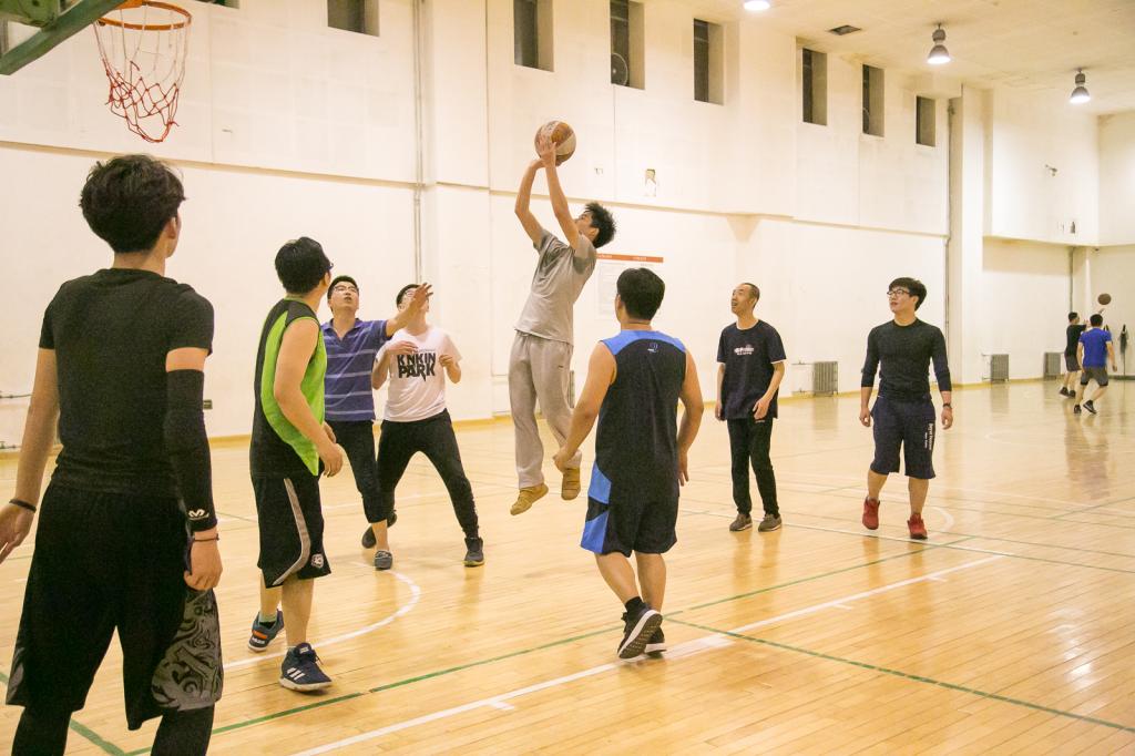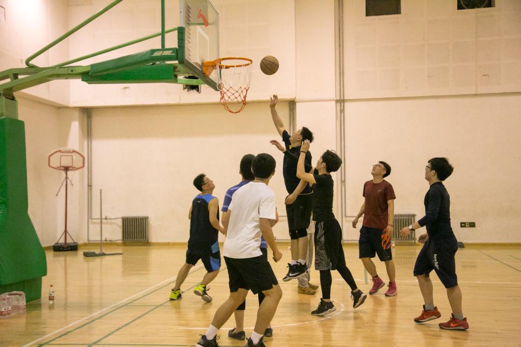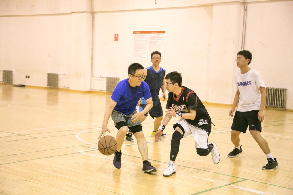 尽管比赛在傍晚开始,劳累一天的师生们依然劲头十足。随着裁判一声哨响,两组的球员同时开战。A组梁鼎同学率先取得控球权,一记漂亮的投篮为学生队拿下了第一分。老师队不甘示弱,黄文彬老师大喊一声,成功从学生手中断球成功,转身、防守、传球,通过几个连贯的动作,成功将球传给齐飞老师。齐老师占据有利地形,高高跳起避开王庆硕同学的防守,中距离投篮成功为老师队赢得一分。学生队体力好、灵活性强;老师队则配合默契、经验丰富。一时间,双方比分焦灼,难分胜负。终于在比赛的第25分钟,凭借王庆硕同学高超的断球技术和梁鼎同学精准的投篮,学生队以微弱领先优势结束了第一局的比赛。