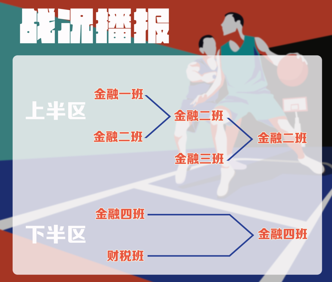 与此同时,金融四班与财税班的对战再度打响。第一节,财税主力曹天明发挥神勇,三步上篮得分。金四不甘示弱,张轩抢断高投进球将比分拉平,胡敦然、叶童配合默契,妙传再进一球。财税逐渐找回手感,最终将比分追平至7:7。第二节,双方女将表现亮眼,李芊锐瞬移夺球拿下首进,王利丽快攻进球得分,张英稳步接球精准投篮再创突破,比分被拉至35:7。第三节,双方交换场地,金四冯梓恒凭借身高优势跳投得分。面对落后局势,财税总结经验,全力追逐:曹天明凭借罚球机会连进两球追回两分,汪泰宇突围上篮进球,最终第三节比分以38:11结束。第四节,在大比分落后的情况下,财税黑马罗斌文突出重重包围,冲刺全场,利用一个漂亮的假动作,快速上篮得分。金四同学也不负众望,在一系列球权辗转后,刘轶韬空手夺球,猛跳进球得分,张轩妙传黄兆刚,亦接连进球。比赛最后时刻,财税汪泰宇再次发起冲击,三步篮进球抢分成功。双方奋战四节,最终金融四班以52:15取胜。