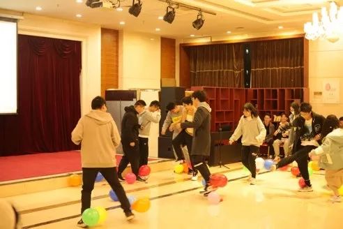 在接下来的游戏互动环节中,台下的同学们体验了“你划我猜”、“踩气球”等有趣的小游戏。不论是以夸张的肢体动作展现“一勺池”、“西区食堂”等耳熟能详的校园地点,还是绞尽脑汁猜测同组搭档表演的内容,“你划我猜”的参与者们由拘谨收敛到放松自如,默契逐渐增加。在“踩气球”环节,同学们将气球绑在脚踝,进攻、防守,不亦乐乎。“砰”,“砰”,气球的爆炸声将活动气氛推向了高潮。