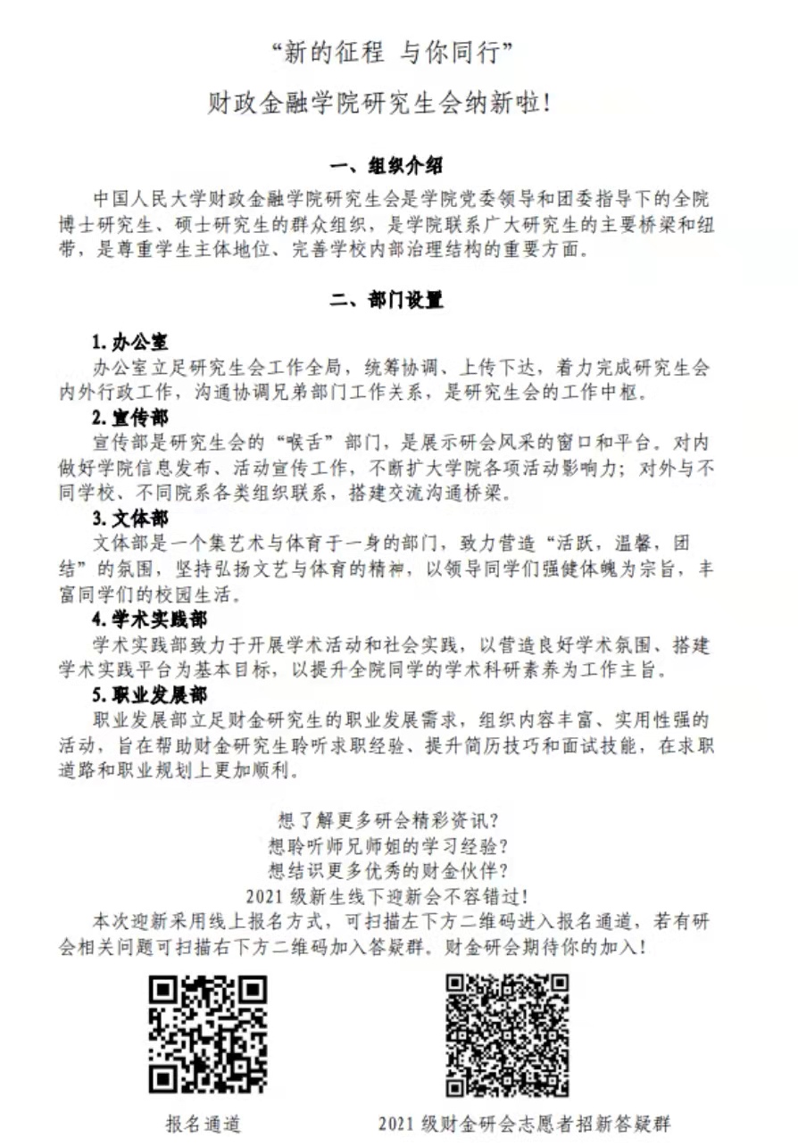 经过持续一周的线下面谈,本届财金研会成功招募百余名志愿者。至此,夜色 研究生会2021年迎新工作圆满落幕。