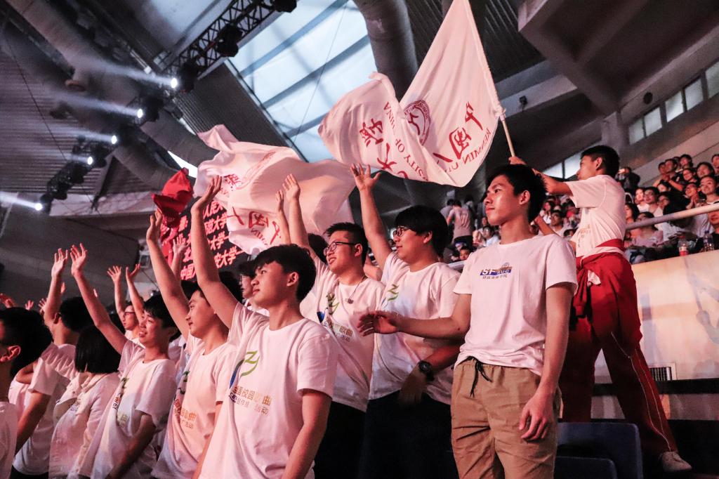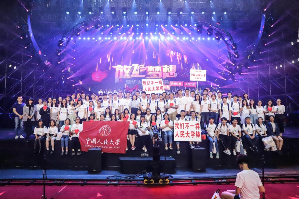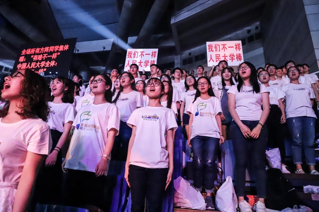 参与活动的还有来自各大高校的学生代表们,我校部分同学到场观看。虽然坐在观众席上,但演出过程中的拉歌,使同学们成为了主角。我校方阵对阵东道主清华大学,承担第一次拉歌第二首曲目的表演,地位十分重要。我校领队任翔宇同学高声道,“人民大学不一样!”。我校方阵全体起立,自信地唱道:“就是不一样!”,随后唱响《我们不一样》,震撼全场。当舞台上表演歌曲时,以夜色 学生为主的我校方阵负责与曲目的配合——时而点亮拇指灯,时而挥动红旗,时而举起红心……导演组的精心编排与同学们的多次排练成就了美妙绝伦的演出效果。最后环节,各校派出代表进行宣誓,我校王庆硕同学上台。“我们是实现中华民族伟大复兴的生力军,我们是中国梦的追梦人,我们更是中国梦的圆梦人”。铿锵誓言,是新时代新青年的承诺。