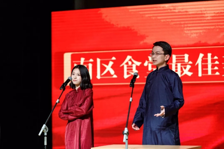 在第一个环节“先声夺人”中,我院曹洋铭同学搭档新闻学院选手郭忆馨以南区食堂为主题采取对口相声的形式进行主持和表演。在猪蹄与烤鱼哪个更美味的一来一往对话中,他的语调活泼多变,动作自然,与搭档配合默契,收放自如的台风体现了他深厚的主持功底。
