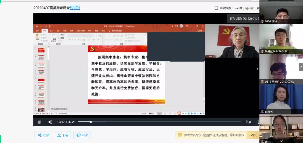 最后,吴美华教授总结道,党章作为党的根本大法,蕴涵了非常丰富的内容,包括党的奋斗目标、党的指导思想、党的纪律等,而人民至上、党的领导、战斗堡垒、党员先锋、核心价值观,这几个关键词是我们体会最深刻的。她告诉大家,只有读懂了这些,才能了解自己应该怎样在战“疫”中淬炼党性,怎样坚守初心担当使命,怎样做一个合格的共产党员。