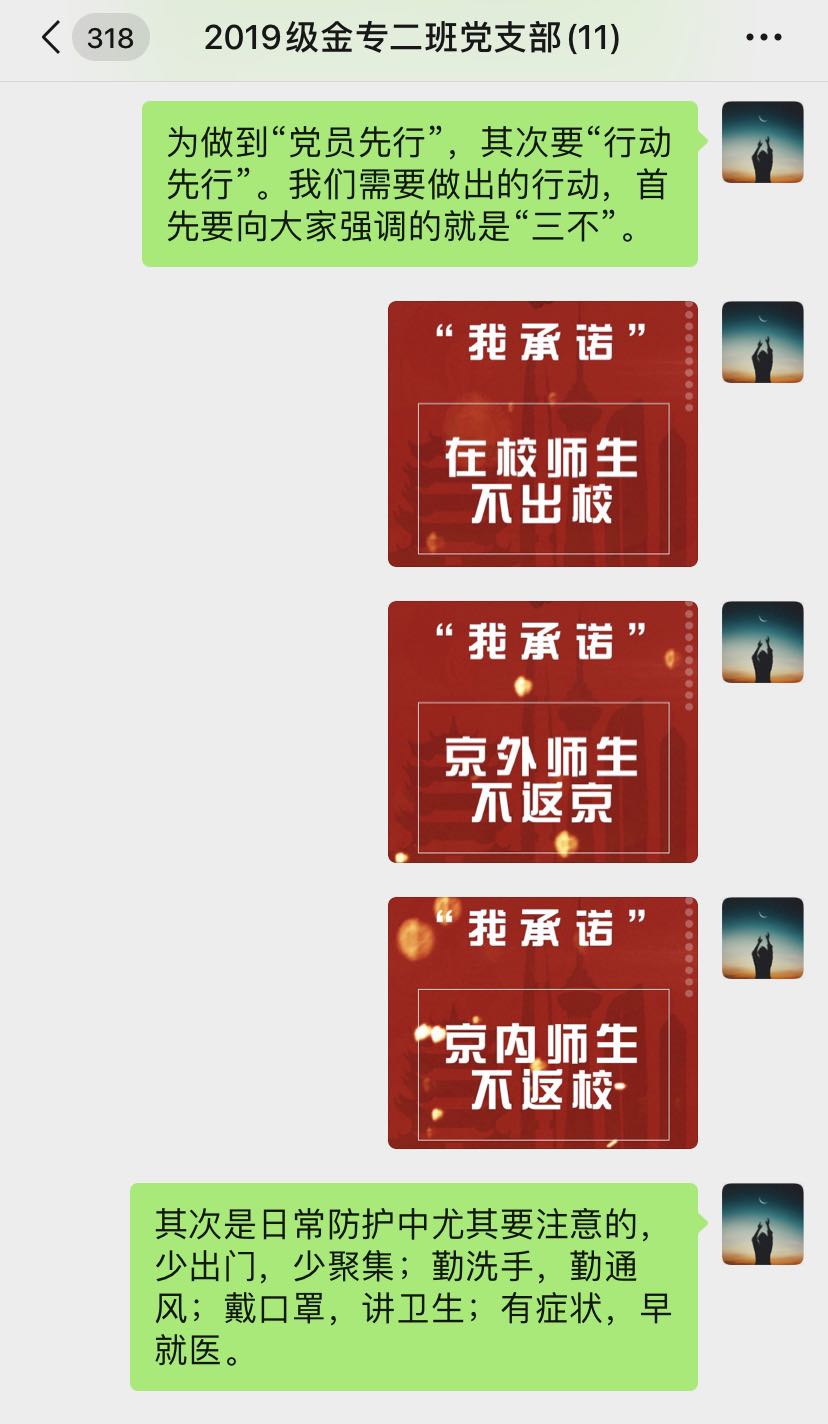 随后进行党课的第二部分——为做到“党员先行”,其次要“行动先行”。结合学院专门制作的“抗击疫情承诺书”,李昂同志着重向大家强调了“三不”原则,即“在校师生不出校,京内学生不返校,京外师生不返京”,同时再次强调了日常防护中的几条注意事项,即“少出门,少聚集;勤洗手,勤通风;戴口罩,讲卫生;有症状,早就医”等。