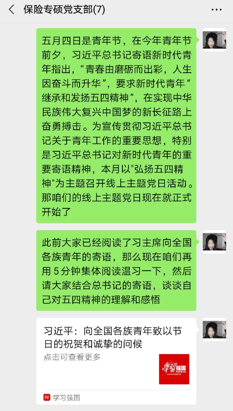 五月四日是青年节,在今年青年节前夕,习近平总书记寄语新时代青年,指出“青春由磨砺而出彩,人生因奋斗而升华”。为宣传贯彻习近平总书记关于青年工作的重要思想,特别是习近平总书记对新时代青年的重要寄语精神,2020年5月16日晚,2018级保险专硕党支部响应学院党委号召,采用线上会议的方式,在支部微信群召开了“弘扬五四精神”线上主题党日活动。本次线上主题党日由支部书记周安文同志主持,支部全体党员参与。