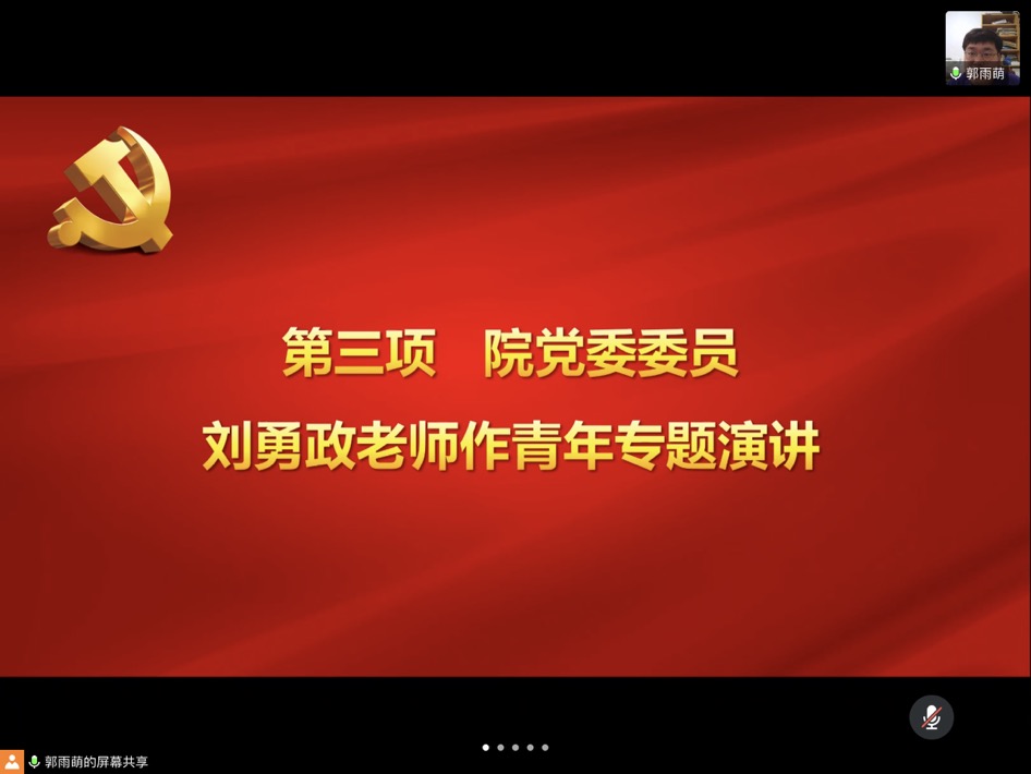 紧接着刘勇政老师向支部同志们讲青年专题党课。刘老师提到,忧国忧民、热爱祖国、积极创新是五四运动的核心精神。他勉励各位博士生党员应该拥有创新探索精神,做好本职研究工作,珍惜学习机会,珍惜易逝韶华,用奋斗的青春谱写无悔的篇章。在这次抗疫战斗中,许许多多的青年医务工作者们冲锋在前,真情奉献,他们用行动证明了新时代青年勇担重任的风采。担当责任无所谓大小,毋以善小而不为,要拥有底线思维。作为子女,应当孝顺父母;作为学生,应当认真听好每堂课,扎实基础潜心科研。只有从小处着手,才能人性化地去担当起社会责任。