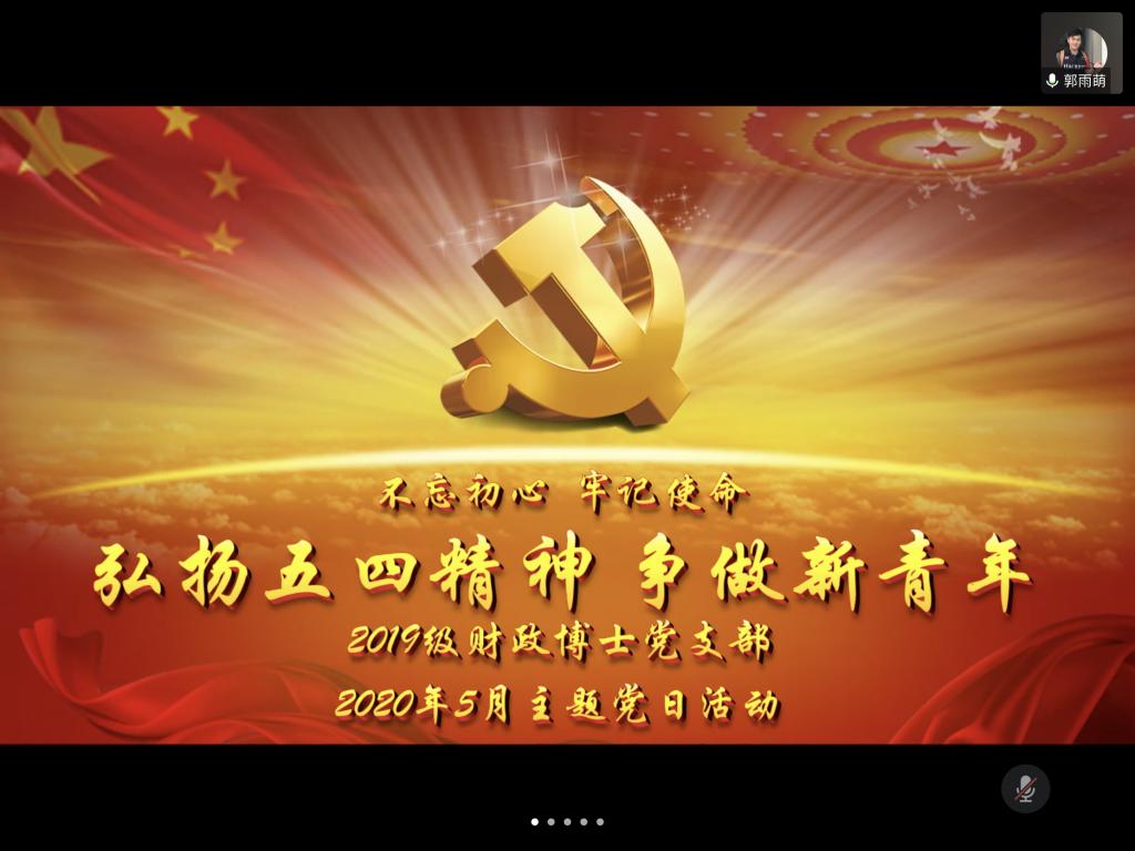 2020年5月16日下午,2019级财政博士党支部通过腾讯会议平台召开了“弘扬五四精神 争做新青年”主题党日线上会议。本次会议由支部书记郭雨萌同志主持,夜色 院党委委员、支部“一联系一帮扶”导师刘勇政莅临指导。