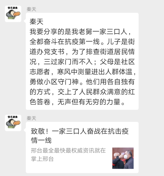 经支委会讨论,2016级本科第三党支部采用“分享身边党员抗击疫情感动事迹”方式进行,党支书兰晶晶同时鼓励支部的各位党员转发疫情防控知识在群内供大家一同学习。