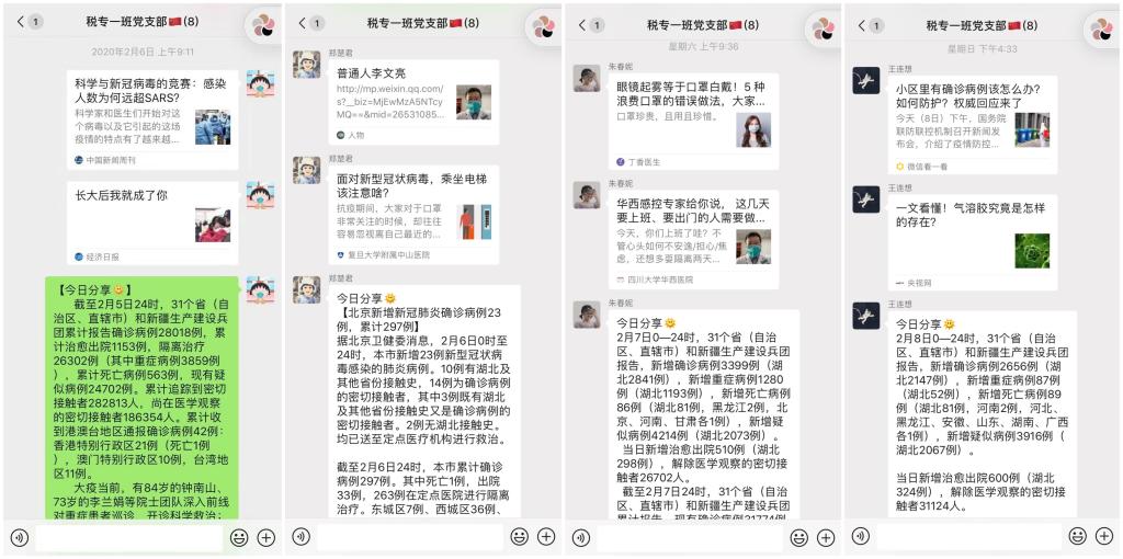 线上主题党日的第二部分为“抗疫信息每日分享”活动。本活动安排党员依次当值,每日将疫情发展情况以及抗疫相关信息在支部内分享,增进支部党员对疫情发展情况的了解掌控,带头提高防控意识,减少传播机会,从而积极做好安全防护措施,有效切断病毒的传播途径。党员们在分享每日疫情发展变化的同时,既向大家宣传普及乘坐电梯防控要点、新冠病毒的科学研究进展、气溶胶的科学解释等防控知识,也不断关注着奋战在抗疫一线的牺牲奉献自我的抗疫英雄们,同时也分享着面对疫情带来的焦虑与恐惧所应开展的“心理防疫”等知识,相互促进,并向身边的亲友等群众普及科学防疫知识。