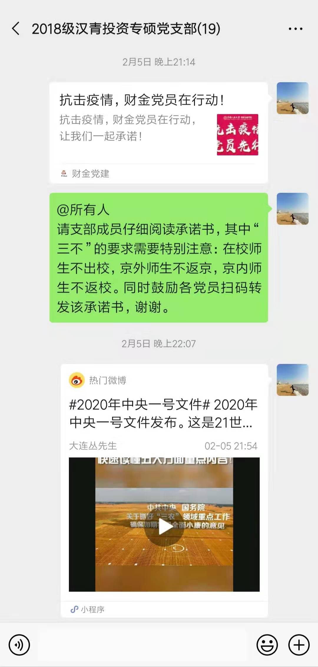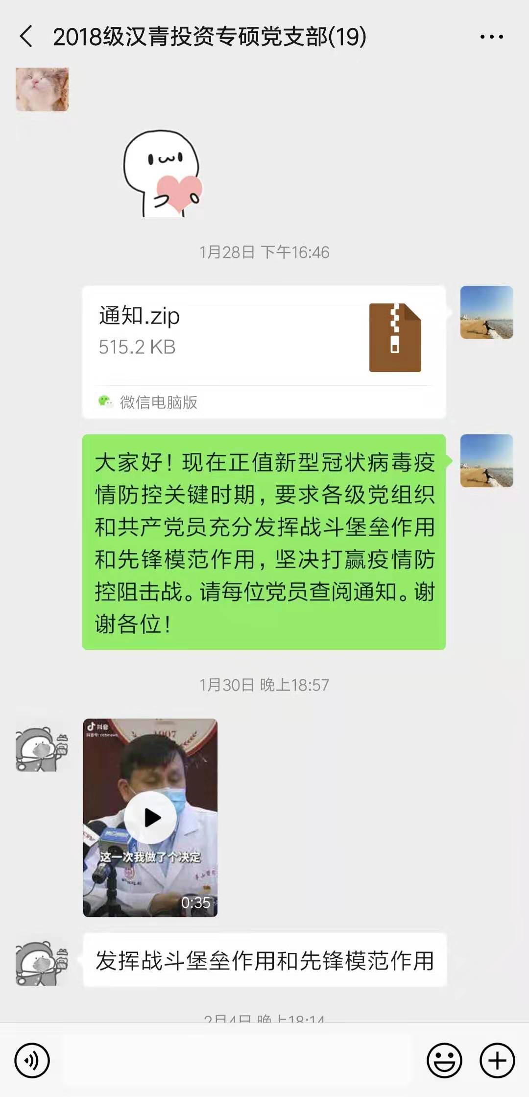 为更好地学习疫情防控相关知识,切实动员广大党员在疫情防控阻击战中争先锋做表率,2020年2月5日上午2018级汉青投资专硕党支部在线上召开了“抗击疫情,党员先行”主题党日活动。本次会议由党支书马申娟同志主持,18名党员同志参加。