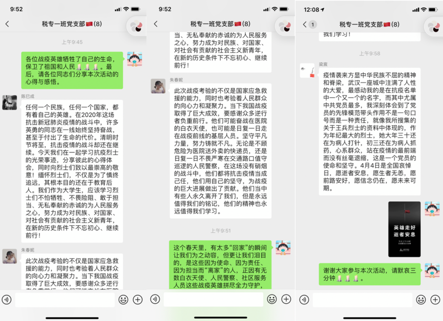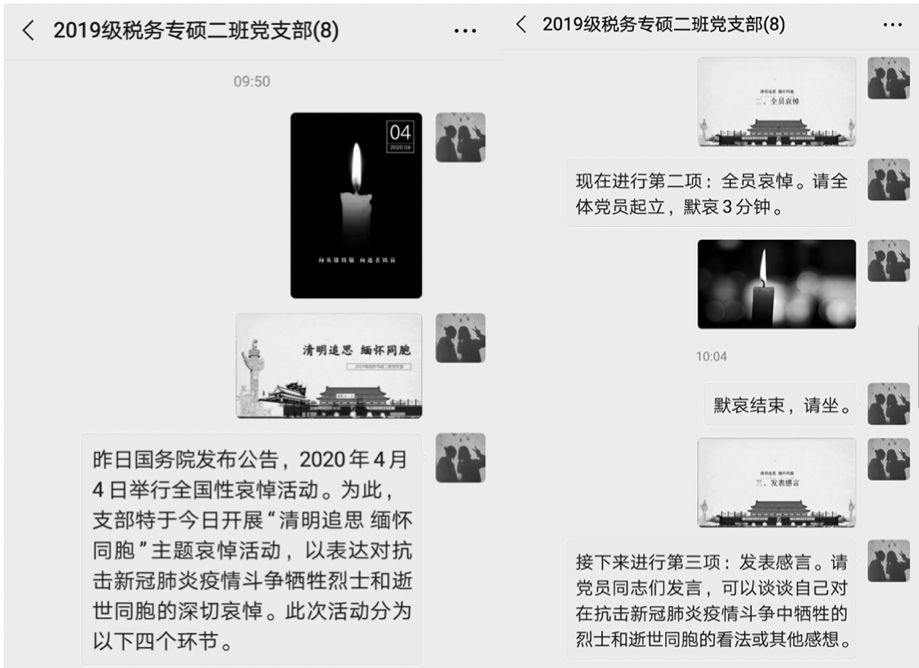 2019级税务专硕二班党支部通过微信群等平台召开了“清明追思,缅怀同胞”主题悼念活动。活动由党支部书记马国焕同志主持召开,全体党支部成员参加了活动。