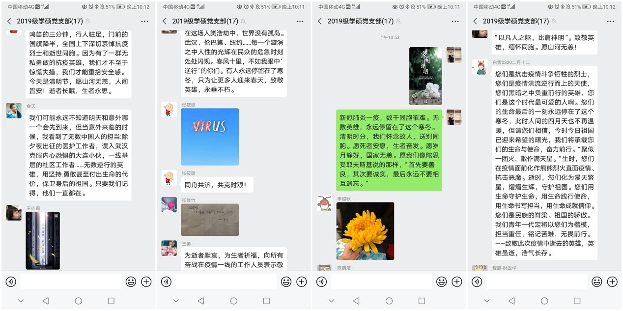 2019级学硕党支部组织悼念活动,共同追念在新冠肺炎中牺牲的英烈和逝世同胞。2019级学硕党支部的14名党员组织了线上哀悼活动,用自己的方式表达了对牺牲英烈和逝世同胞的哀思。