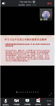 接下来,支部党员观看了习近平总书记在4月前往浙江考察的视频资料,并对其讲话内容进行深入学习。习近平总书记强调,要全面贯彻党中央各项决策部署,做好统筹推进新冠肺炎疫情防控和经济社会发展工作,坚持稳中求进工作总基调,坚持新发展理念,坚持以“八八战略”为统领,干在实处、走在前列、勇立潮头,精准落实疫情防控和复工复产各项举措,奋力实现今年经济社会发展目标任务,努力成为新时代全面展示中国特色社会主义制度优越性的重要窗口。