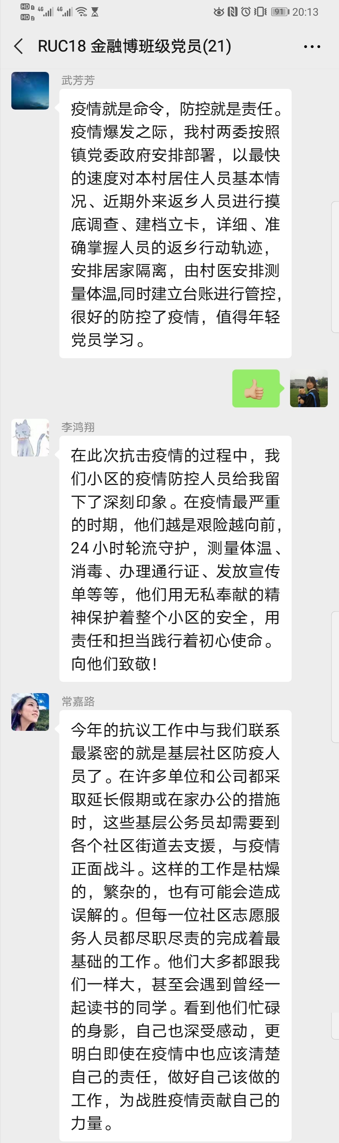 为贯彻教育部《在常态化疫情防控中加强高校基层党建“四个一”行动方案》要求,深入学习习近平总书记对疫情防控重要指示精神,2018级金融博士党支部于2020年7月11日20:00通过党员微信群,开展了7月线上主题党日活动。本次活动以“迎党的生日、讲战疫故事、悟初心使命”为主要内容,采取了线上微党课学习和集体讨论的形式,参会党员分别讲述了自己或身边的抗疫故事,并谈了心得体会。