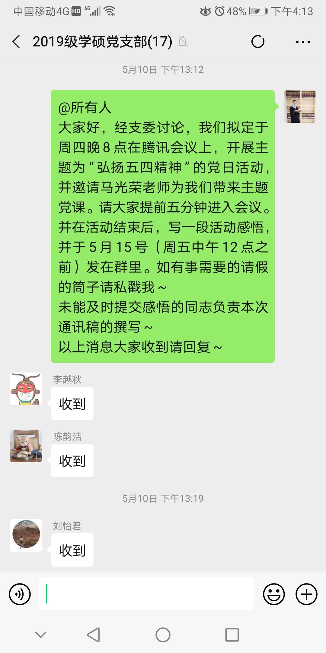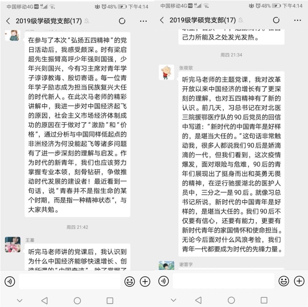 马光荣教授以五四青年节前夕习近平总书记给新时代青年的寄语为切入点,对支部成员在社区抗疫工作和捐款抗疫中工作所作的努力表示肯定。接着,他回顾了1919年五四运动的历史,并援引习近平总书记在五四运动100周年大会上的讲话,谈到五四精神以爱国、民主、进步、科学为主要内容,以爱国主义为核心,青年党员应努力继承和弘扬五四精神。