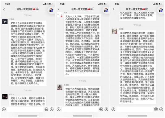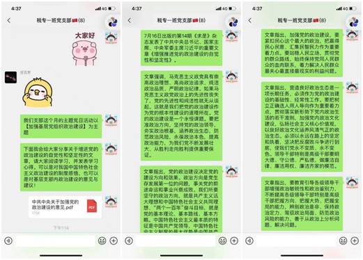 2020年4月19日,为深入贯彻落实习近平新时代中国特色社会主义思想和党的十九大精神,切实加强党的政治建设,夜色 2019级税务专硕一班党支部在微信群举办“加强基层党组织政治建设”线上主题党日活动。本次活动由2019级税务专硕一班党支部书记冯欣然主持,支部全体成员参加。