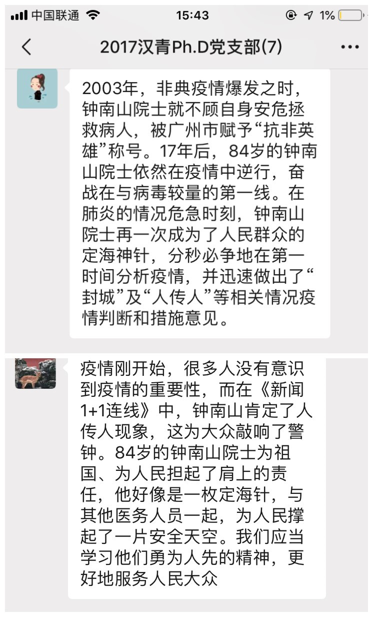 预备党员徐天歌同志讲述了钟南山院士的感人事迹。2003年,非典疫情爆发之时,钟南山院士就不顾自身安危拯救病人,被广州市赋予“抗非英雄”称号。17年后,84岁的钟南山院士依然在疫情中逆行,奋战在与病毒较量的第一线。在肺炎的情况危急时刻,钟南山院士再一次成为了人民群众的定海神针,分秒必争地在第一时间分析疫情,并迅速做出了“封城”及“人传人”等相关情况疫情判断和措施意见。