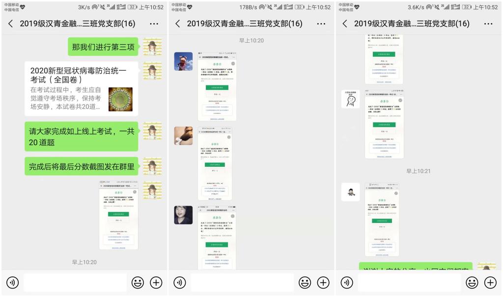 2020年2月12日晚,2019级汉青金融专硕三班党支部响应学院党委号召,在支部微信群组织开展了“抗击疫情,党员先行”线上主题党日活动。本次线上会议由陈嘉欣书记主持,全体党支部同志积极参与。