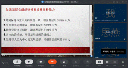 会议开始,党支部书记李欣怡在钉钉群中分享了片名为“十九大报告关键词——基层党组织建设的目标和任务”的视频链接,支部成员对该视频进行了认真学习。该视频以图文动画形式对十九大报告关键词“基层党组织的目标和任务”进行了详细具体的解读。习近平总书记在全国组织工作会议上指出,加强党的基层组织建设,关键是从严抓好落实。要以提升组织力为重点,突出政治功能,健全基层组织,优化组织设置,理顺隶属关系,创新活动方式,扩大基层党的组织覆盖和工作覆盖。习近平总书记关于加强基层组织建设的重要论述,为新时代全面推进基层党组织建设指明了方向,提供了遵循。