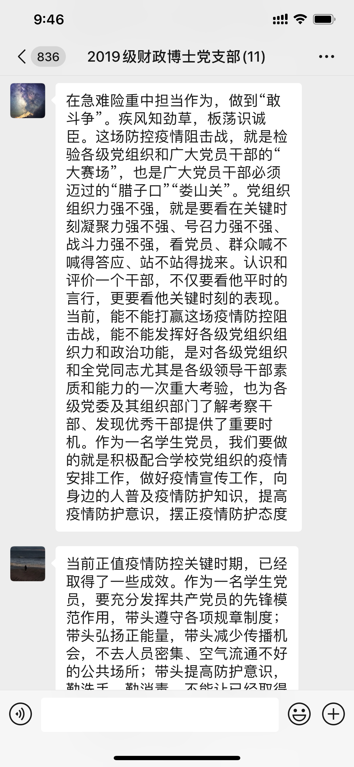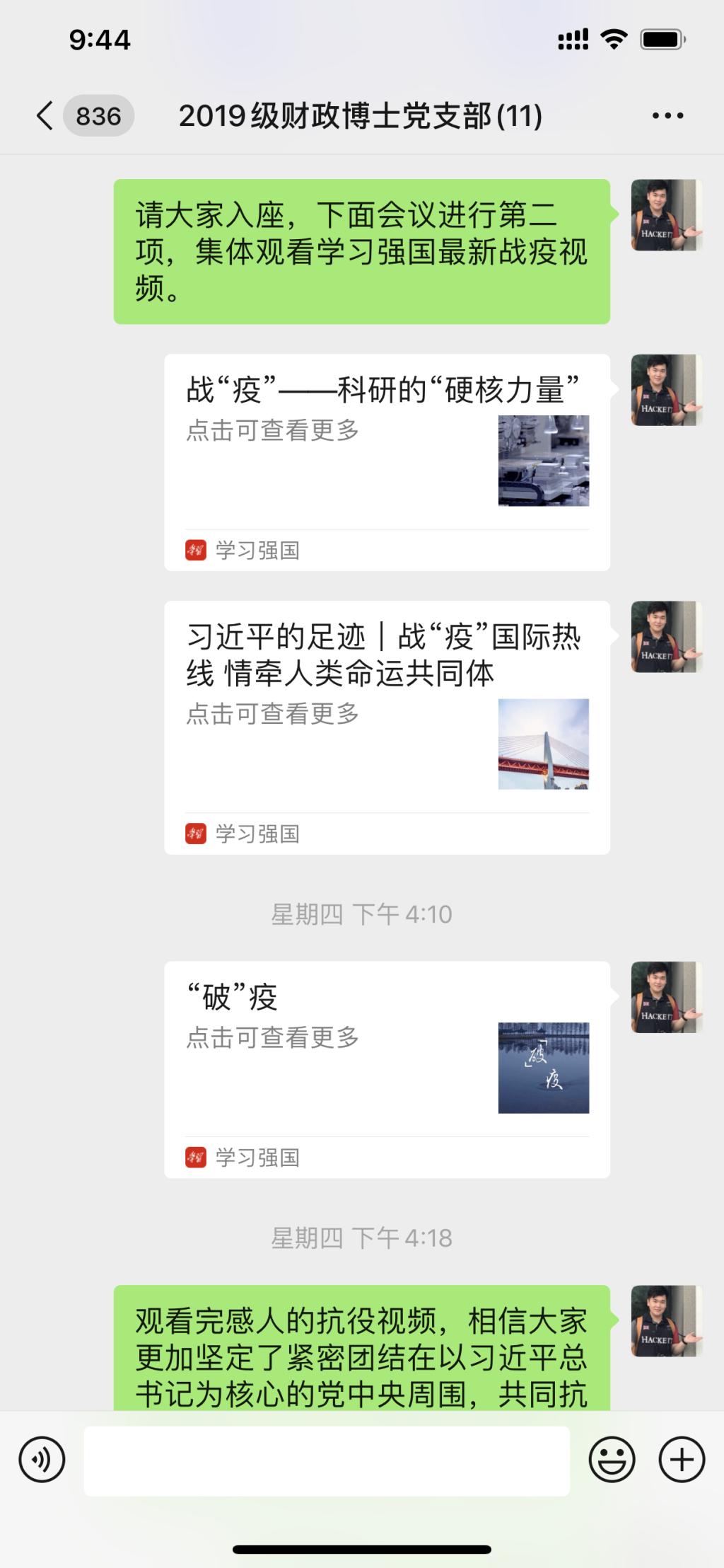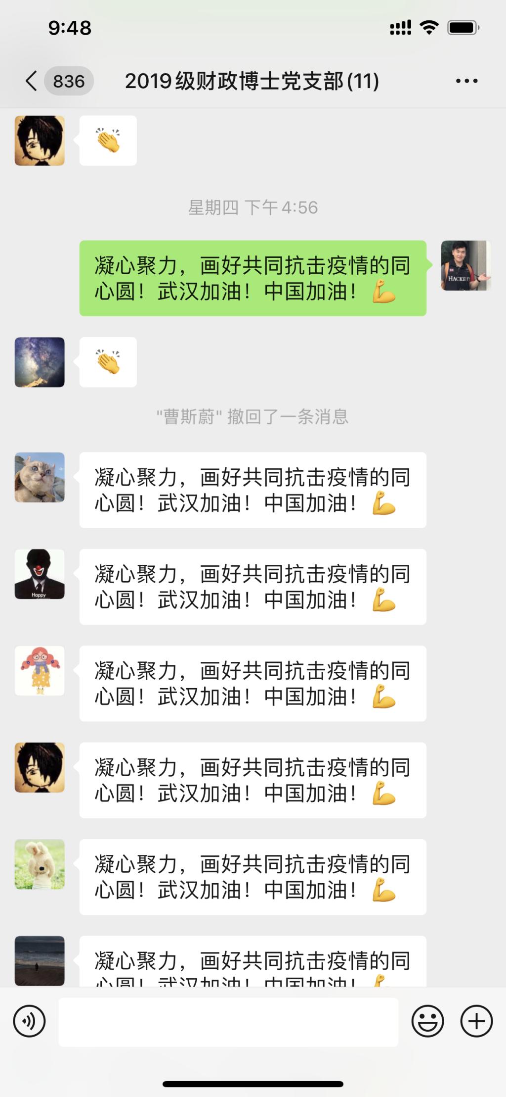 2020年3月5日下午4点,2019级财政博士党支部在支部微信群召开了本年度第二次线上会议。本次会议由党支部书记郭雨萌主持,全体成员参与。时值巩固抗击新型冠状病毒疫情的关键时期,全体党员在线上积极交流,充分发挥战斗堡垒作用和先锋模范作用,巩固深化了“不忘初心、牢记使命”主题教育成果。
