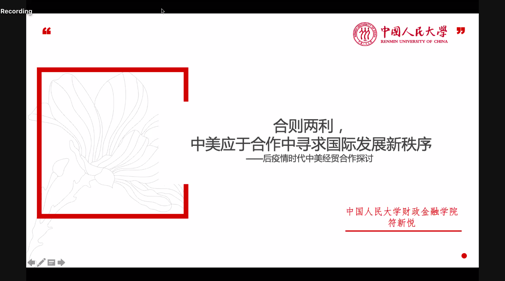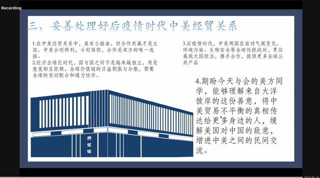 来自匹兹堡大学的Rebecca Chuhui Chen同学阐述了中美合作的条件,并针对中美合作推动国际经济复苏与健康发展发表了自己的观点。